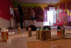 But before discussing some of the pieces that are now on the walls of the student party room I would like to first thank our guest, professional street artist Guillaume Cayrac for his great ideas and for sharing with us his genuine love for spray paint art.